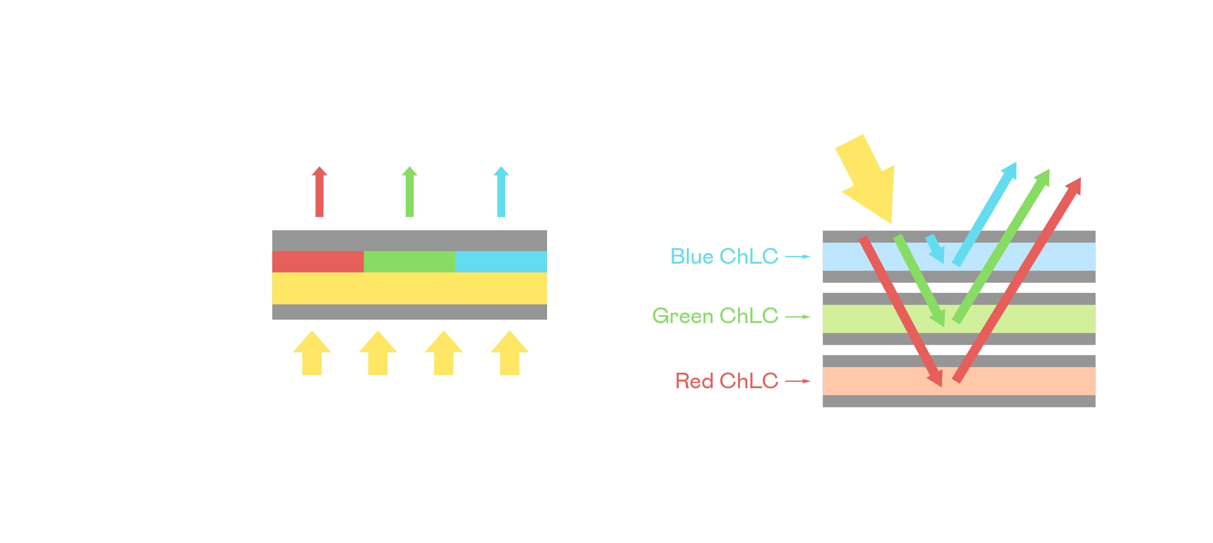 ks凯时胆固醇液晶显示器是由红、绿、蓝三层胆固醇液晶面板堆叠而成,并采用无彩色滤光片设计,减少环境光在反射过程中的损耗。